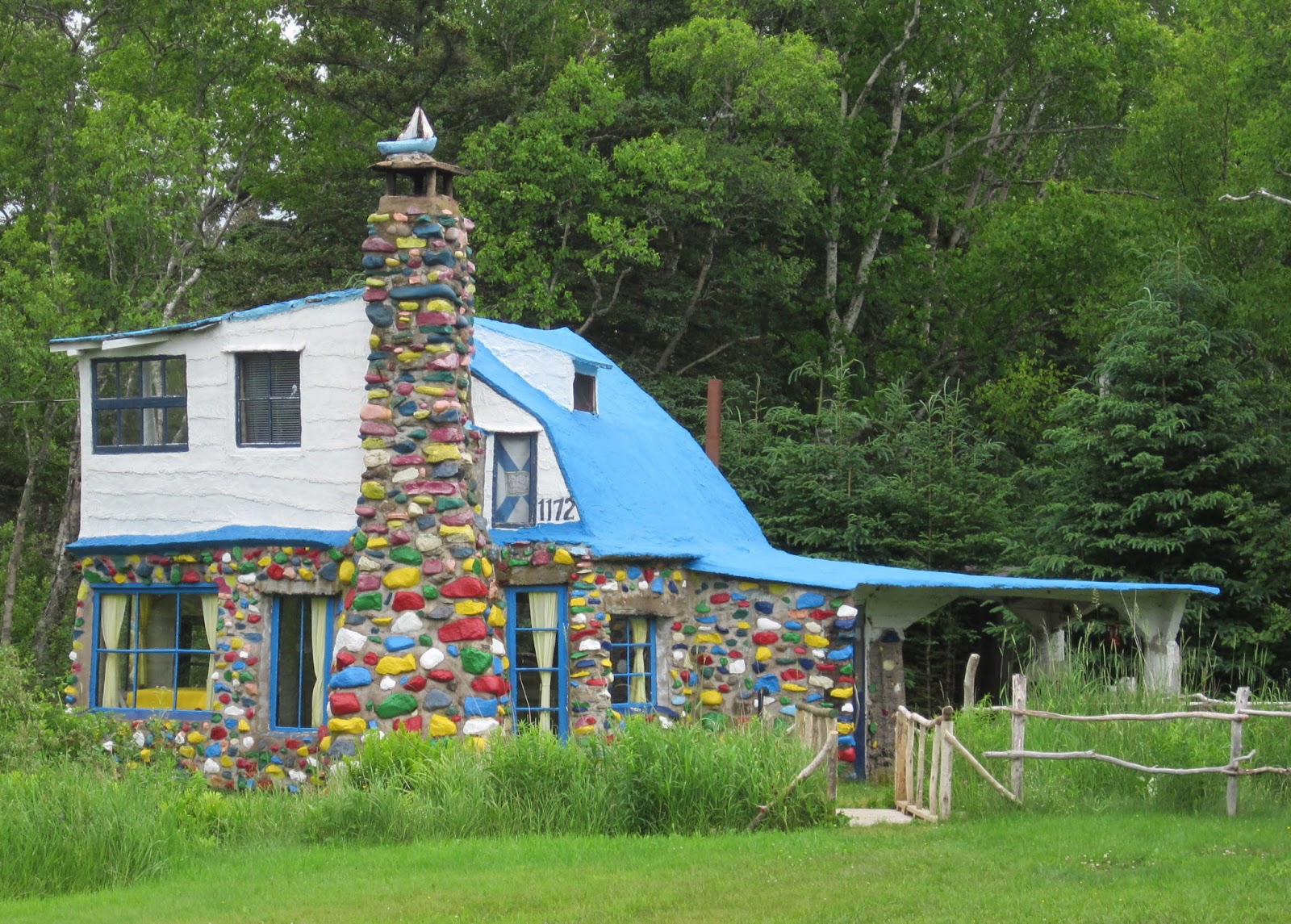 In 1929, Charles William MacDonald began building 5 houses from concrete and local rocks. He was a local man, who believed in the power of concrete. Check out the website dedicated to his work, to read more about him and these funky little houses. Four of them survive. http://www.concretehouse.ca/uncommon/BlueCottage.pdf